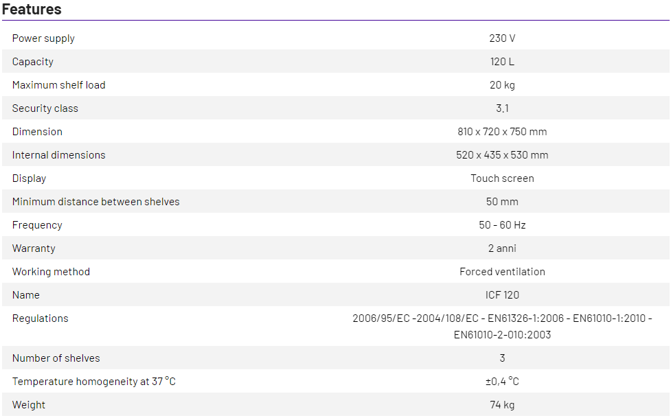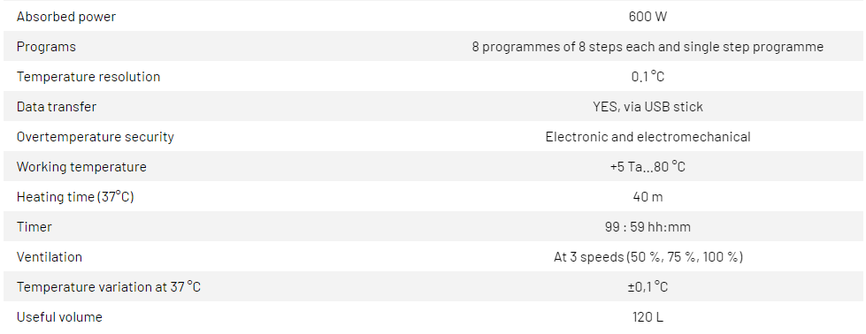 Weight 74 Kg. 230V / 600 W. Supplied with calibration report at 37 °C, executed with instrument Accredia certificated.