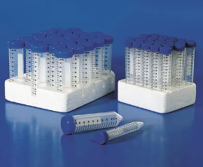 15 and 50 ml graduated conical tubes in high-transparency PP with large white marking area. Withstands temperature extremes of - 80⁰C to + 121⁰C. Includes blue thread design plug seal cap with ribbed edge for safe and easy opening and closing. Conical bottom for total sample recovery. Easy to read graduations are pre-printed as follows: 15 ml tubes are graduated in 0.5 ml subdivisions from 2 to 15 ml. 50 ml tubes are graduated in 2.5 ml subdivisions from 5 to 50 ml. Designed for sample collection or transportation. Apyrogenic, endotoxins/free, autoclavable and carry the CE conformity mark pursuant to Directive 98/79/CE. Tubes are sold in packs of 50 (15 ml) and 25 (50 ml) respectively.