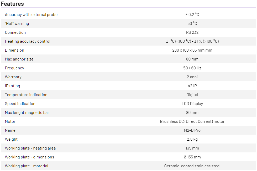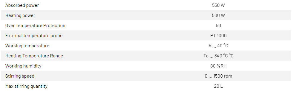 3 pre-set operating modes, control, and maximum temperature protection with visual alarm on the display, “Stirring” function control. Stainless steel plate with diameter of 135 mm.