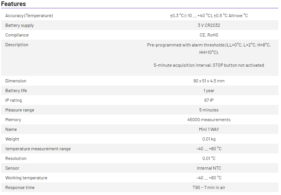 The MINI T1 Data Logger is equipped with an external pointed steel probe,
