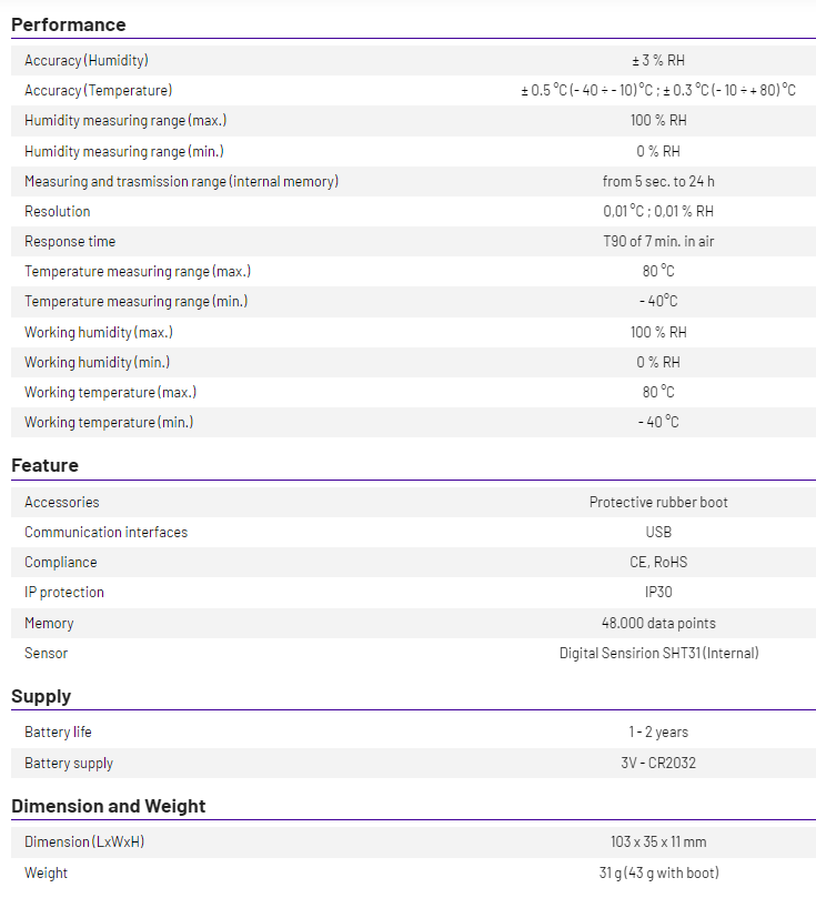 1 channel with internal or external sensor, and multifunction display for viewing: current value and minimum, maximum and average temperature, time spent by the logger outside the set thresholds. Marking an event on the logger via the Start button. Ability to store 48,000 measurements (interval 5 sec ... 24 hours). Internal battery (1 year battery life) replaceable. Start with START button with delayed start option. STOP button activated via software to manually stop the recording.