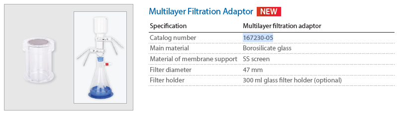 Catalogue number: 167230-05Material: PTFEMaterial of membrane support: SS screenFilter diameter: 47 mmFilter holder: (Optional) Glass filter holder 300 mL