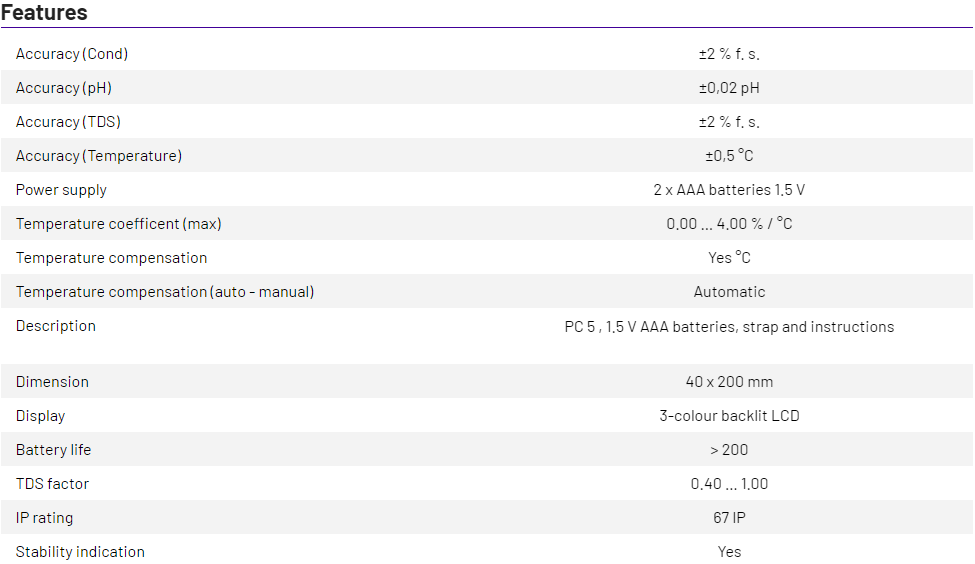 IP67 watertight portable multiparameter for pH, Conductivity, TDS and Salinity measurements.