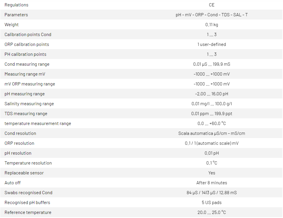 pH 7 and pH 4 buffer solutions in a 25 ml sachet, storage solution in sachet, 1x75ml Redox solution 475 mV, standard solution 1413 µS in a 25 ml sachet, calibration cap, strap, handkerchiefs and carrying case.