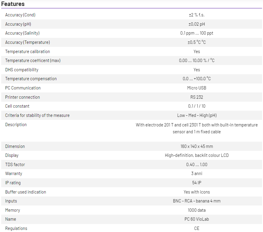 Supplied as standard:Electrode holder stand, colored buffer solutions, USB cable for data download to PC, power supply and instructions for use.
