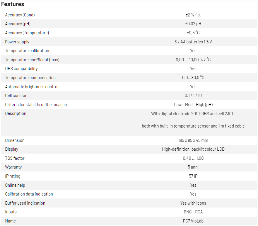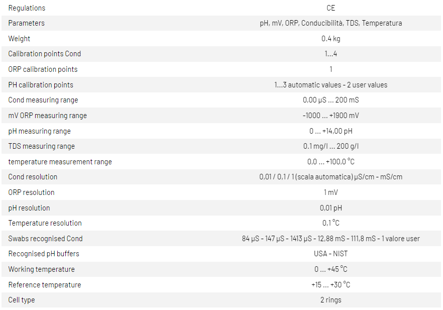 - Measurement of pH, mV, ORP, Conductivity, TDS, with temperature display and the possibility to select the parameters you want to view.