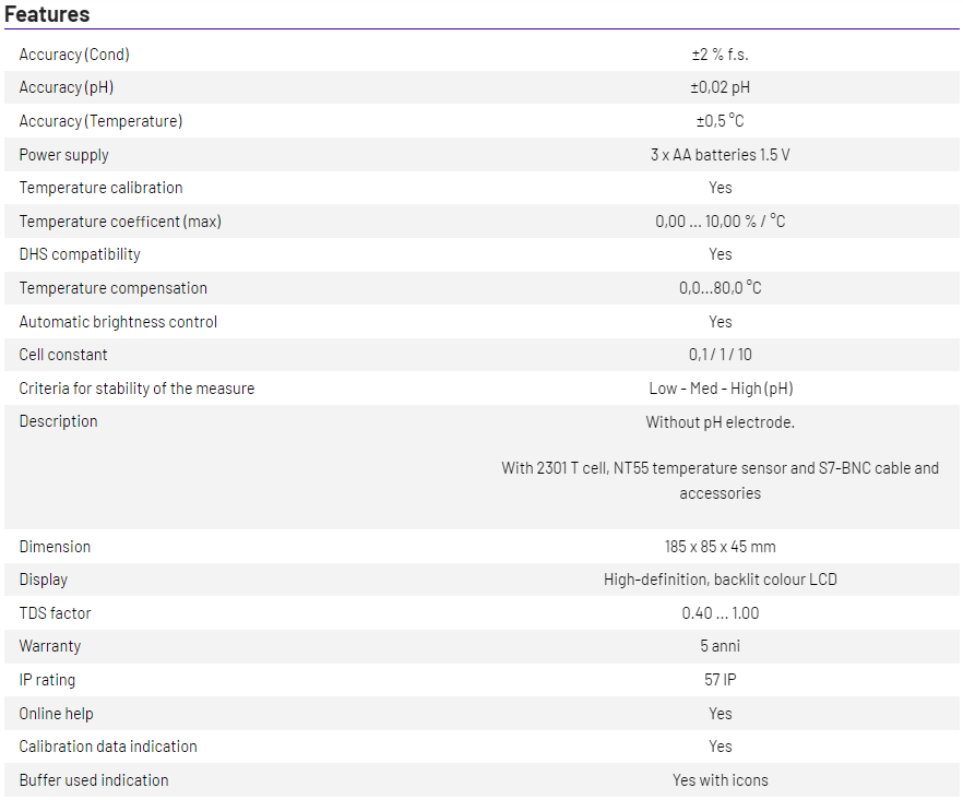 - Measurement of pH, mV, ORP, Conductivity, TDS, with temperature display and the possibility to select the parameters you want to view.