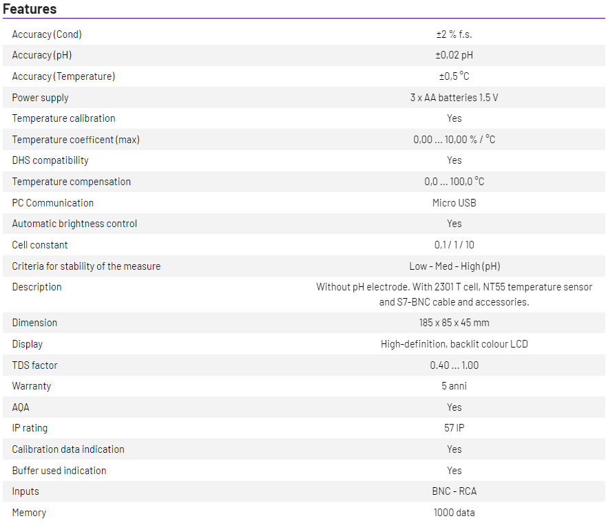 - Measurement of pH, mV, ORP, Conductivity, TDS, Salinity with temperature display and possibility to select the parameters you want to view.