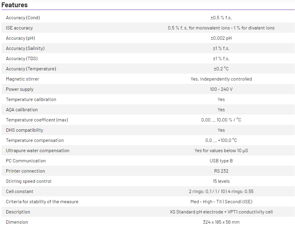 Supplied as standard: Magnetic stirrer, S7/BNC cable, NT 55 temperature probe, electrode holder stand, colored buffer solutions, external keypad, USB cable and multi socket power supply.