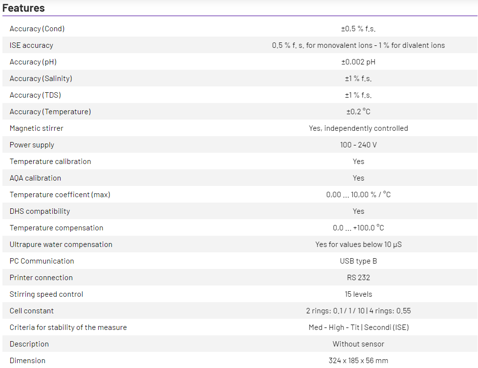 • Automatic EC calibration up to 1 to 4 points with recognition of standards and calculation of different constants of cell + 1 point manual.