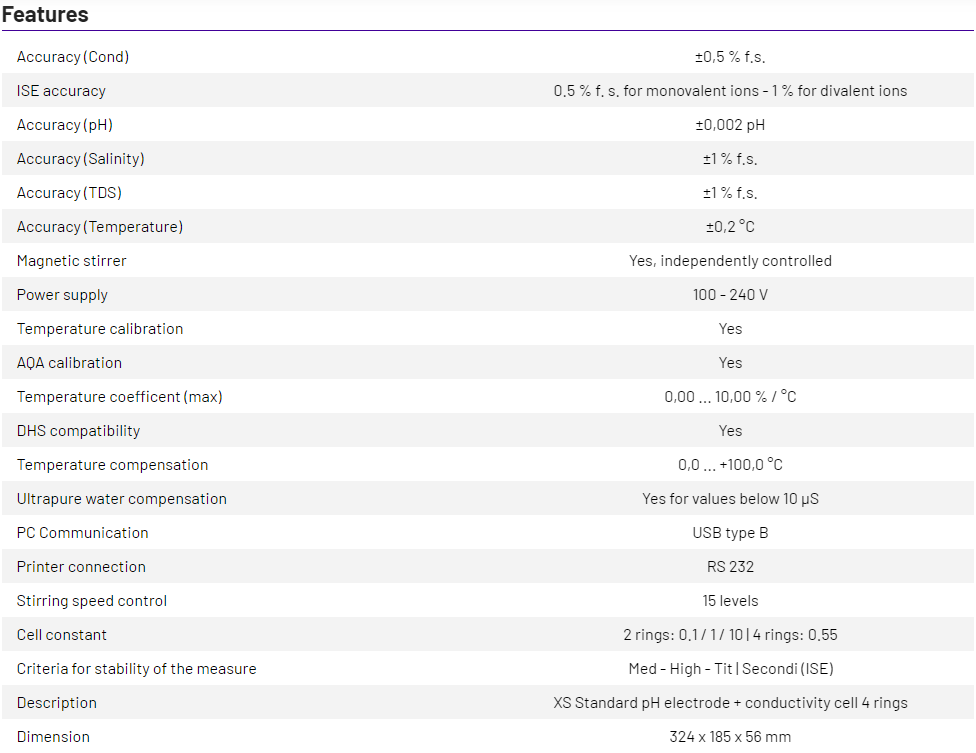 Supplied as standard: Magnetic stirrer, S7/BNC cable, NT 55 temperature probe, electrode holder stand, colored buffer solutions, external keypad, USB cable and multi socket power supply.
