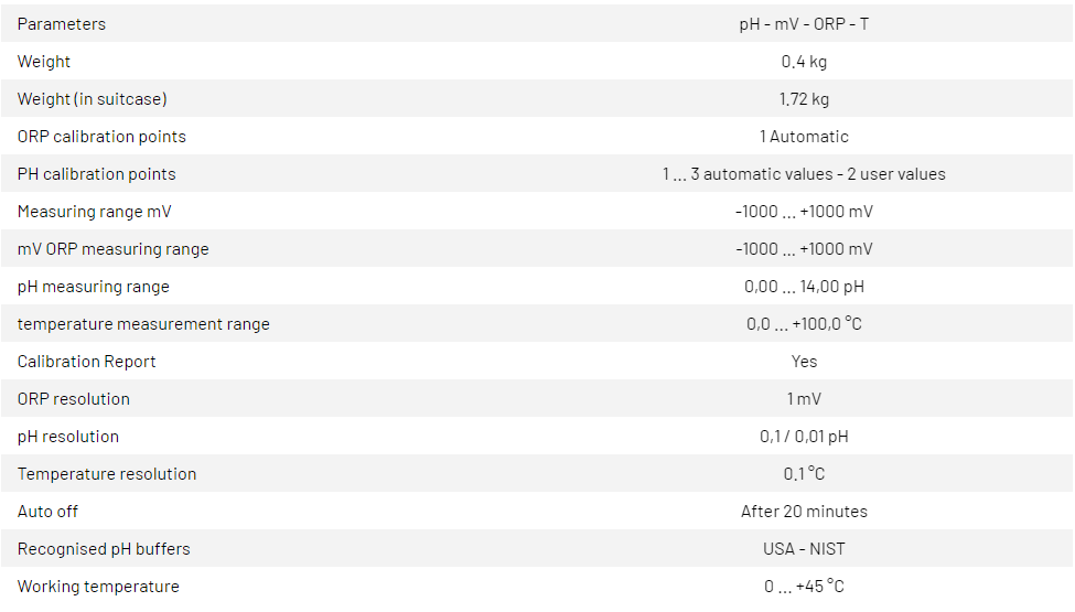 - Measurement of pH, mV, ORP, with temperature display and possibility to select the parameters you want to view.