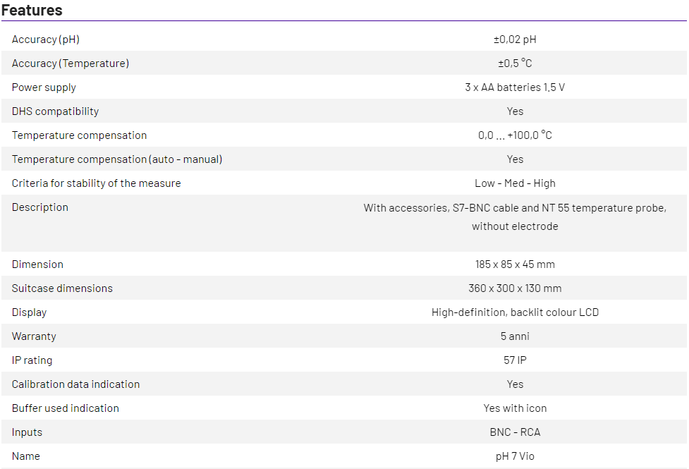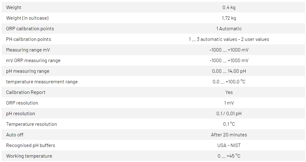 - Measurement of pH, mV, ORP, with temperature display and possibility to select the parameters you want to view.