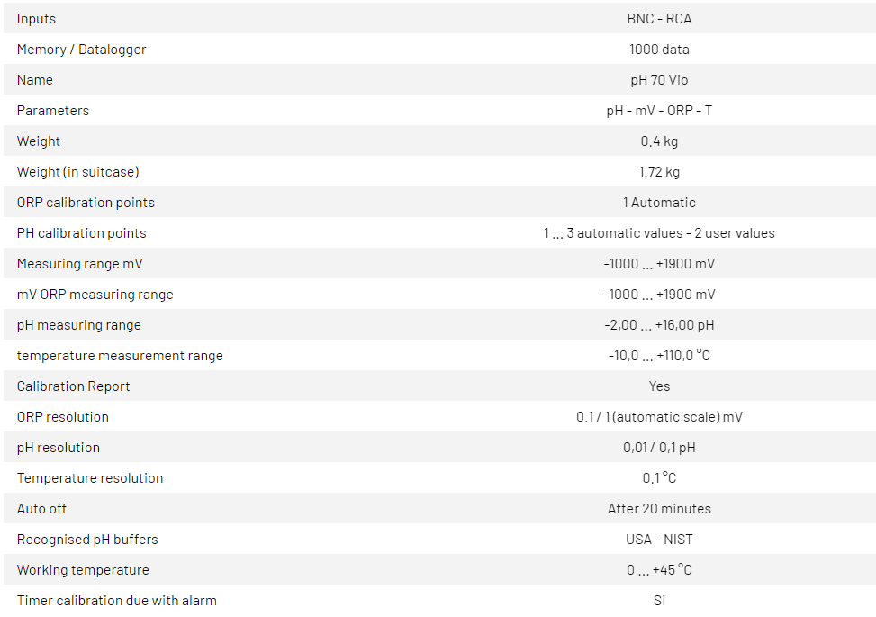 - Measurement of pH, mV, ORP, with temperature display and possibility to select the parameters you want to view.