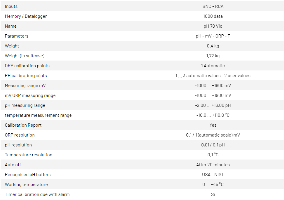 - Measurement of pH, mV, ORP, with temperature display and possibility to select the parameters you want to view.
