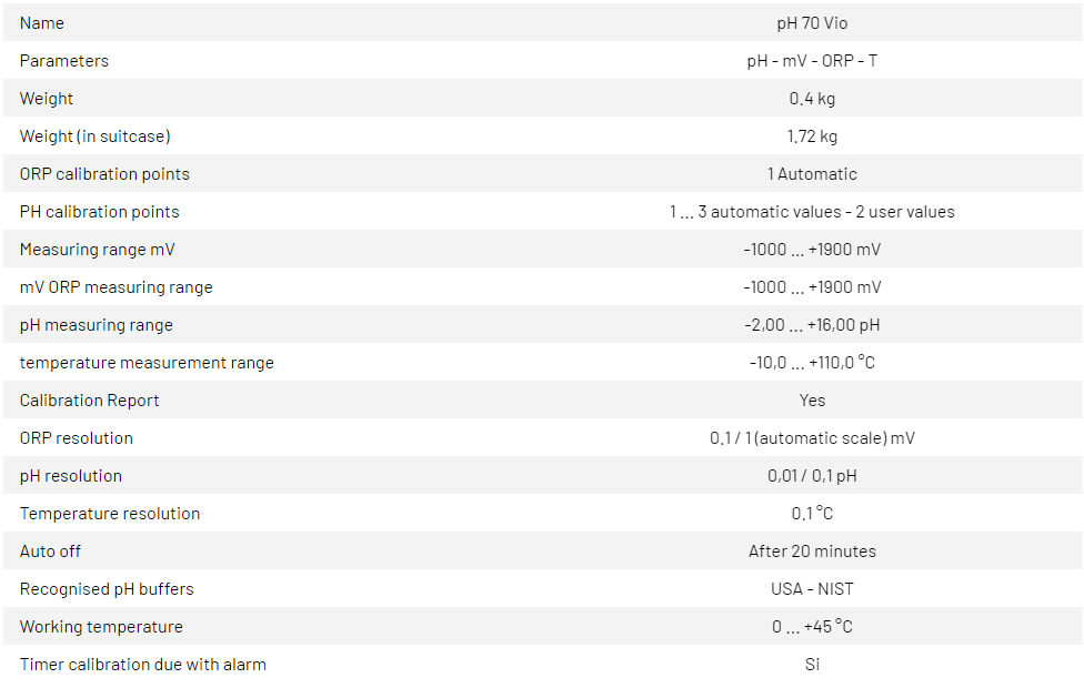 - Measurement of pH, mV, ORP, with temperature display and possibility to select the parameters you want to view.