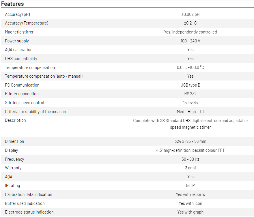 - Automatic pH calibration on different buffer families, or manual (5 values).