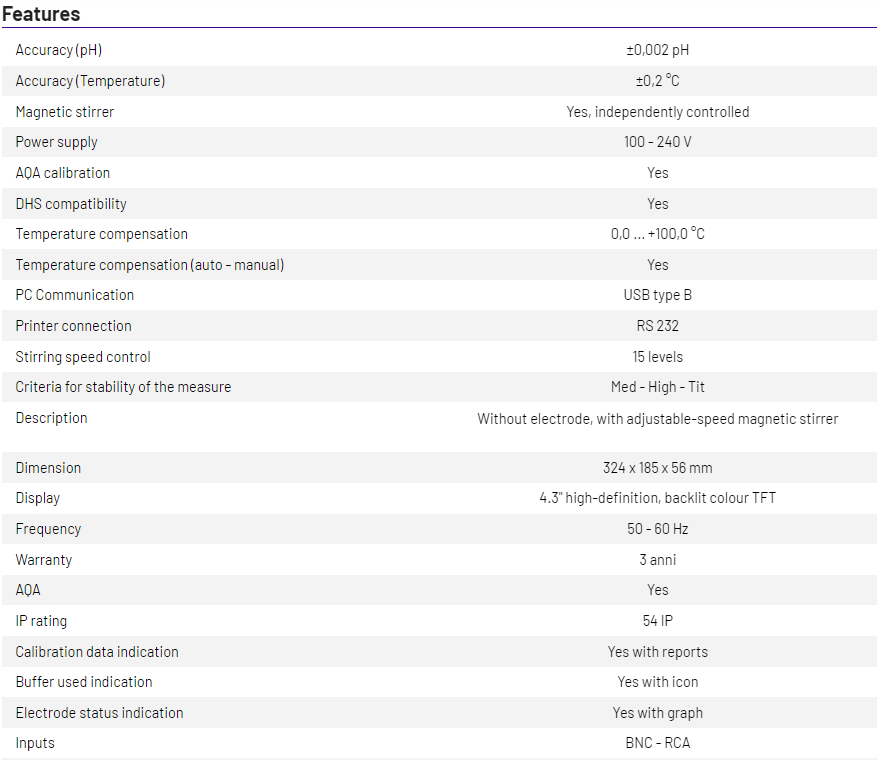 - Automatic pH calibration on different buffer families, or manual (5 values).