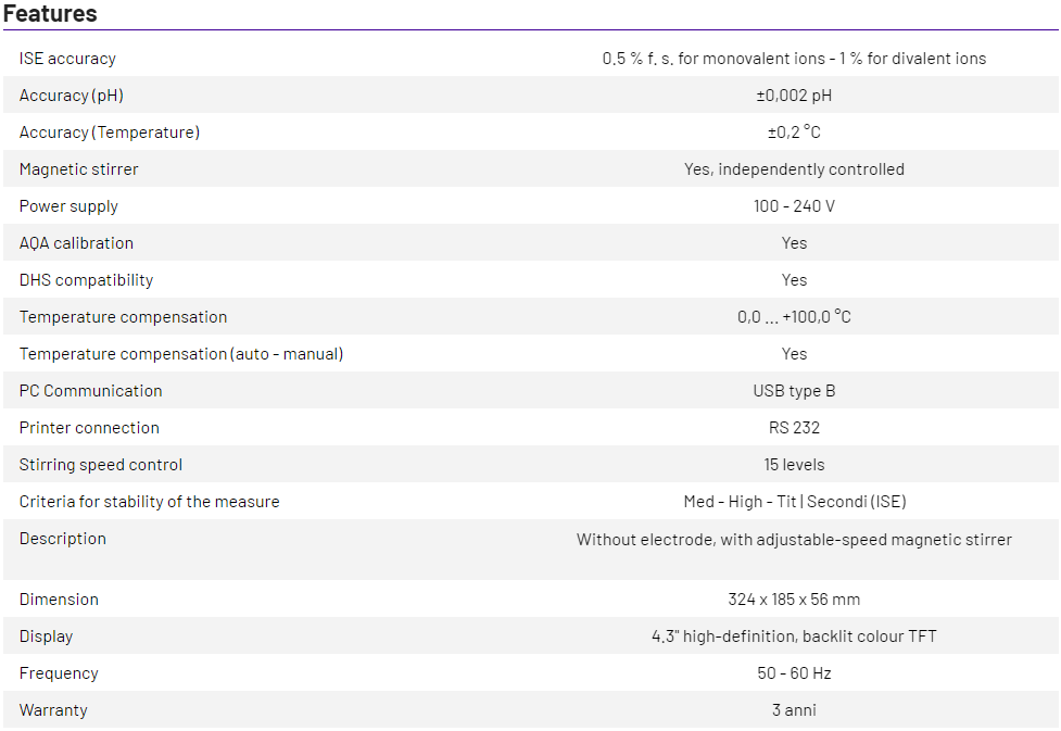 Supplied as standard: Magnetic stirrer, S7/BNC cable, NT 55 temperature probe, electrode holder stand, colored buffer solutions, external keypad, USB cable and multi socket power supply.
