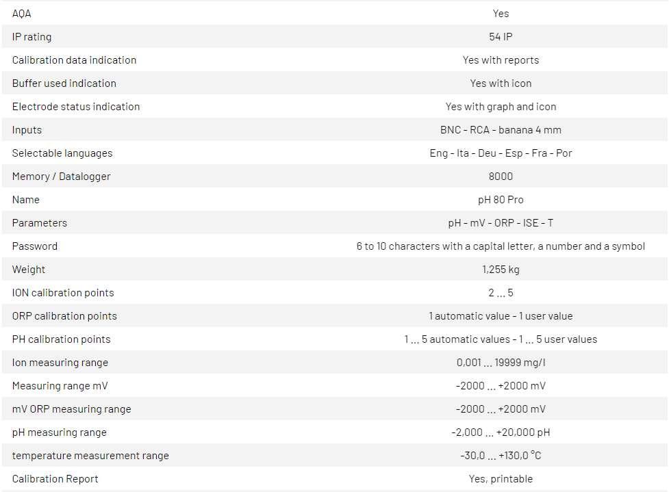 - Automatic (6 buffer families) or manual pH calibration on 5 values.