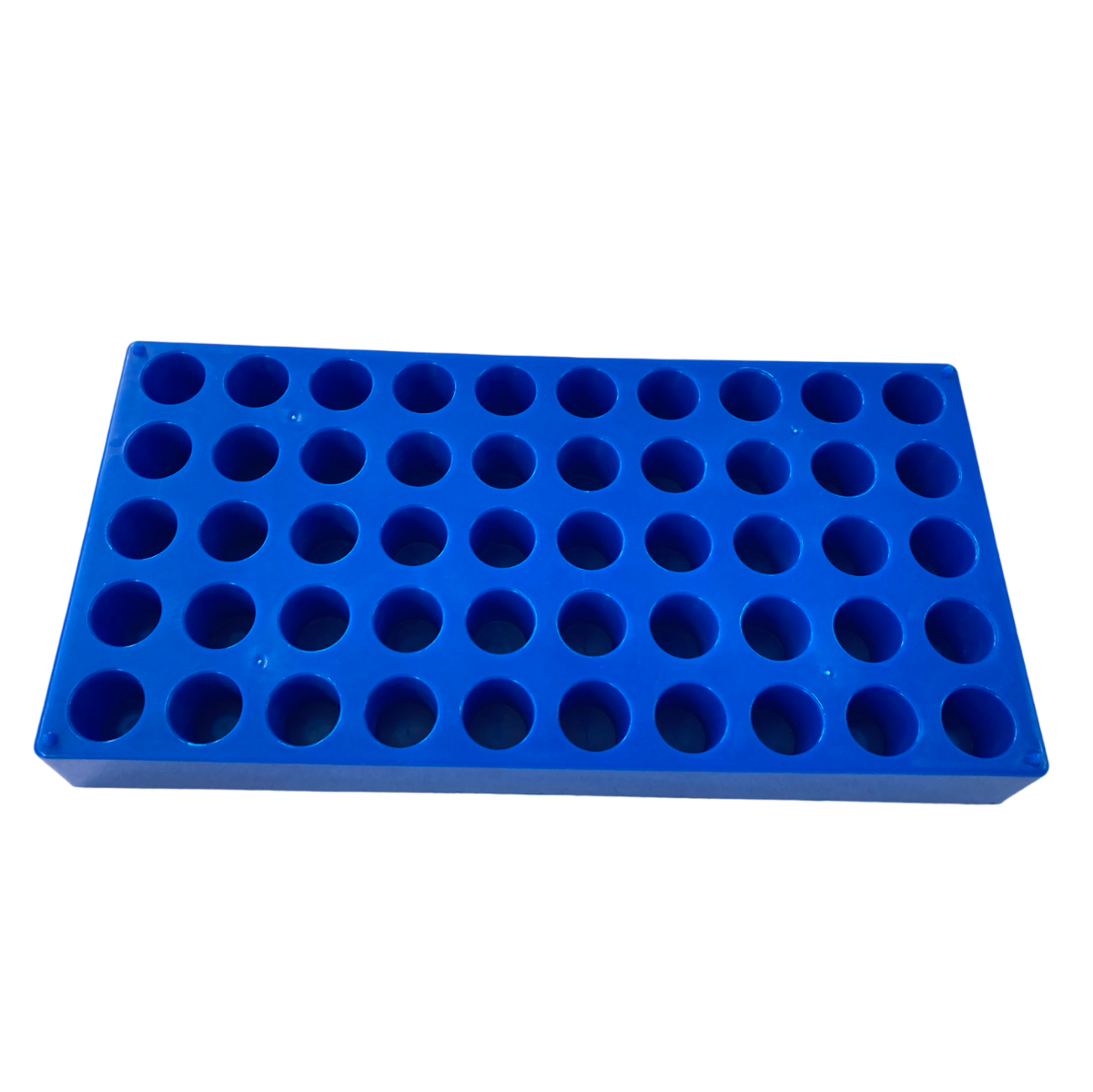 50 position polypropylene vial rack blue for all vials with a diameter of 15 mm max. and flat bottom dimensions: 240 x 120 x 28 mm stackable