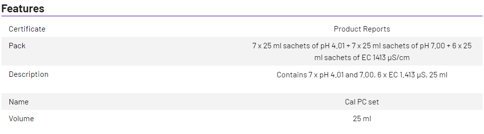 It contains 7 x pH 4.01 and 7.00, 6 x EC 1.413 μS , 25 ml