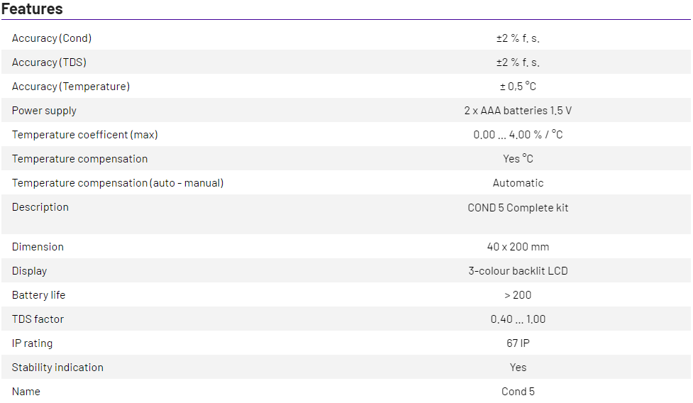 1413 µS buffer solutions and 12.88 mS in 25 ml sachet, calibration cap, strap, handkerchiefs and cardboard case.