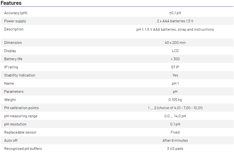 Calibration with button for 1 or 2 points (choice of pH 4, 7, 10).