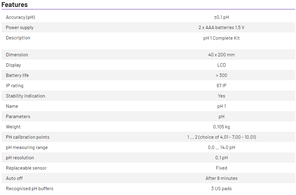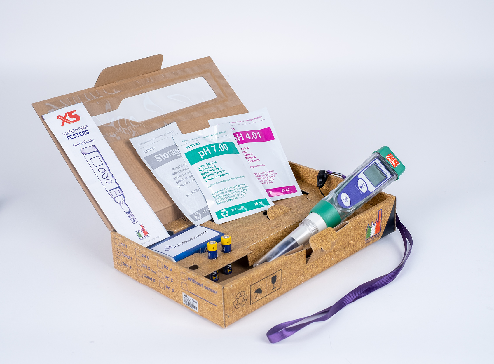 pH 7 and pH 4 buffer solutions in a 25 ml sachet, storage solution in sachet, calibration cap, strap, handkerchiefs and cardboard case.