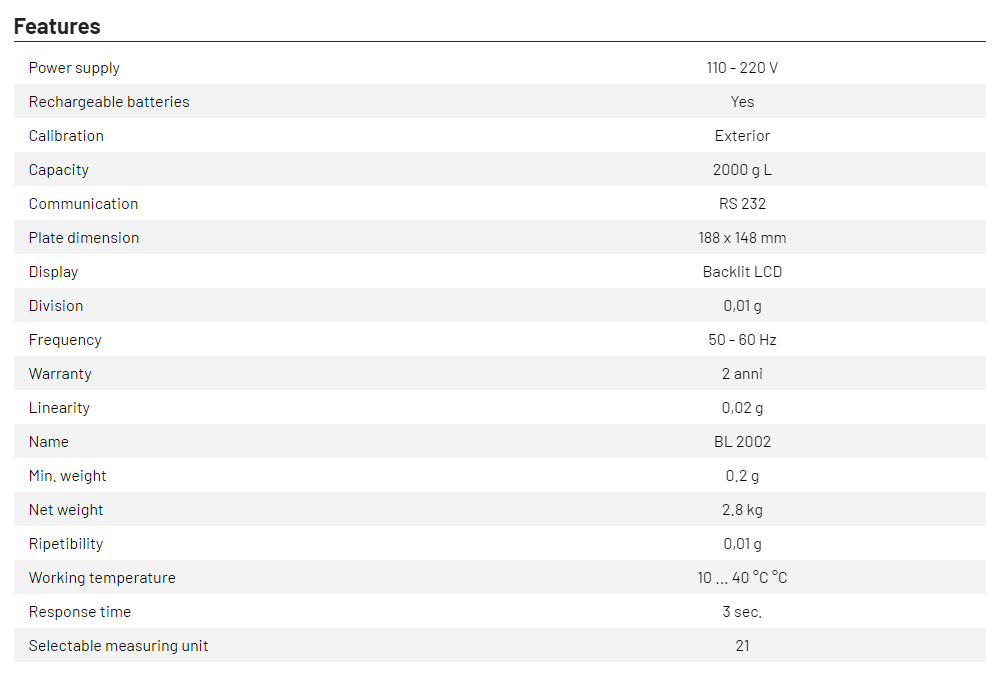 Digital balance with backlight display Capacity: 2000 g, division: 0,01g, repeatability: 0,01g, linearity: ± 0,02g. Pan size : 188 x 148 mm. 21 different selectable units, items counter function, determination of %. RS-232 output for PC and Printer.