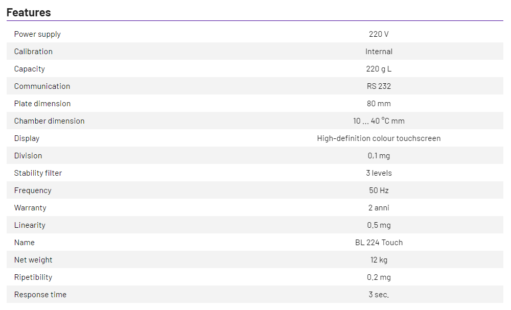 BL 224 TOUCH, digital balance touch screen display, max. capacity 220 g, resolution 0,1 mg, internal calibration, counting samples function, various units measure, with glass plate protection box. Supplied with Certificate of calibration made with weights certified Accredia.