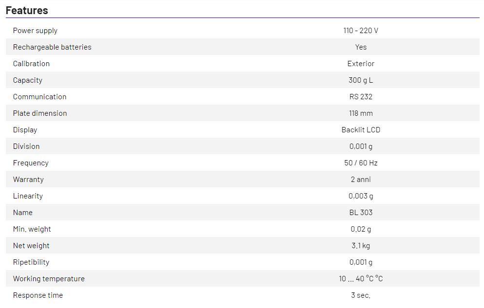 Digital balance with backlight display Capacity: 300g, division: 0,001g, repeatability: 0,001g, linearity: ± 0,003g.