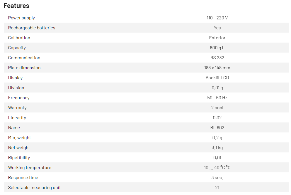 Pan size : 118 mm diameter, 21 different selectable units, items counter function, determination of %. RS-232 output for PC and Printer.