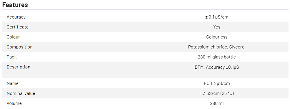 1x280 ml XS Conductivity Standard 1,3 µS/cm ± 0,1 / 25°C glass bottle with DFM certificate