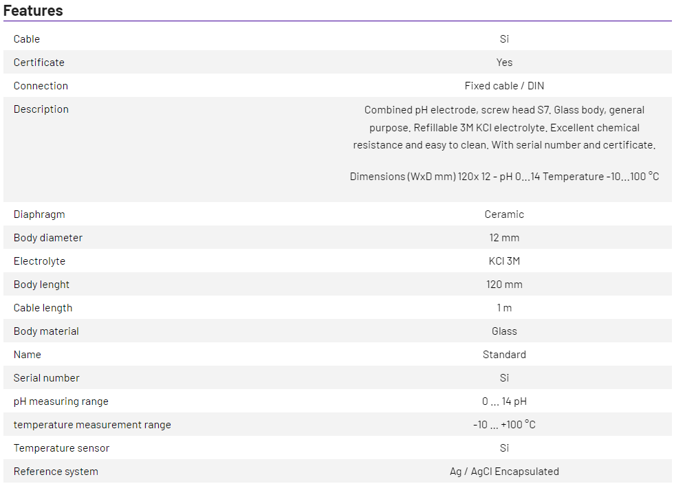 Combination pH electrode, length 120 mm with fixed cable DIN plug.